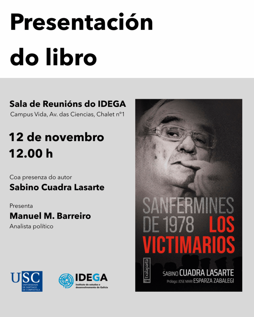 O vindeiro 12 de novembro ás 12.00 h, a sala de reunións do Instituto de Estudos e Desenvolvemento de Galicia (IDEGA) acollerá a presentación do libro Sanfermines de 1978. Los victimarios (Txalaparta, 2025). O acto contará coa presenza do seu autor, Sabino Cuadra, abogado, sindicalista e político, e será conducido polo analista político da USC Manuel M. Barreiro.